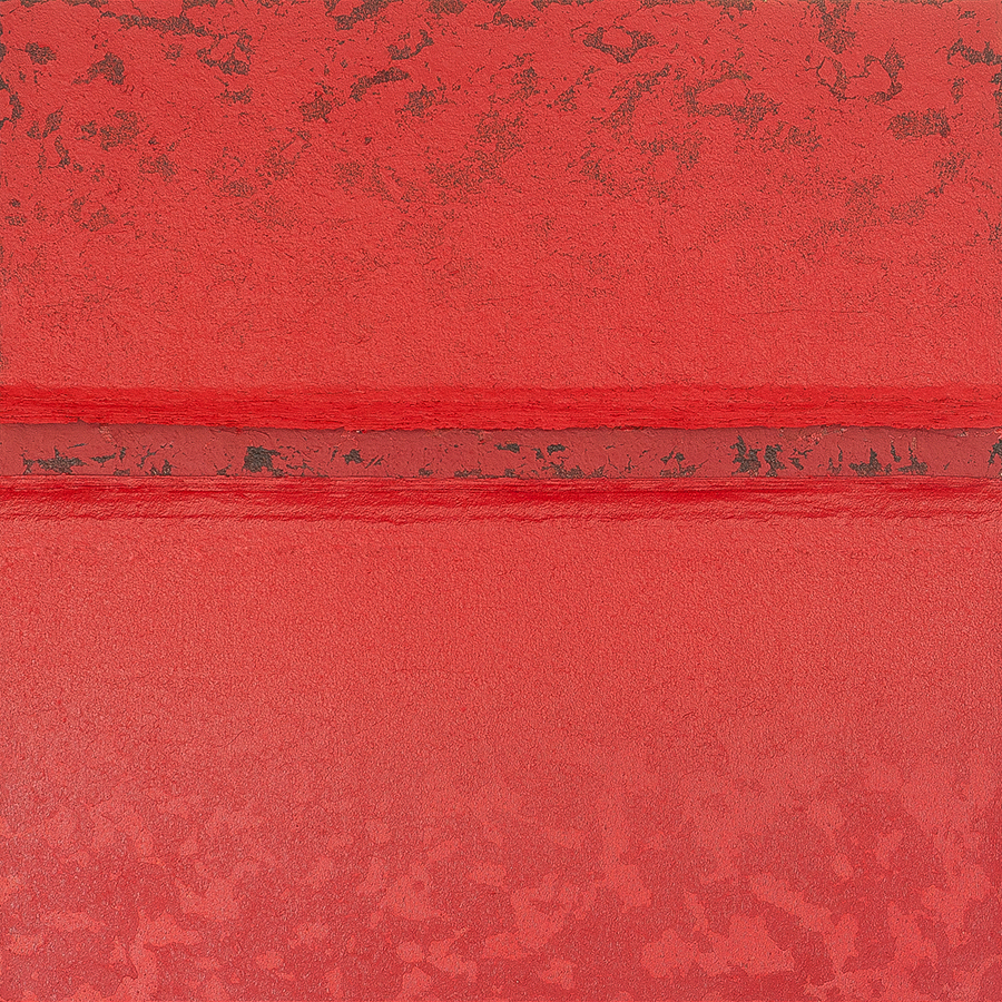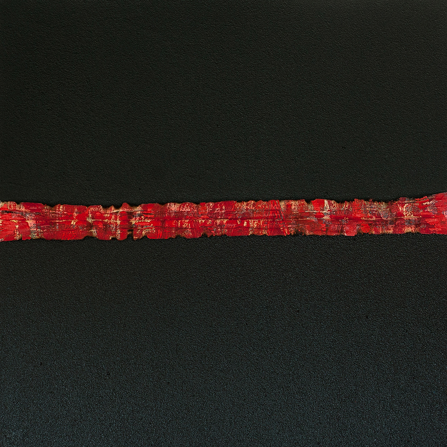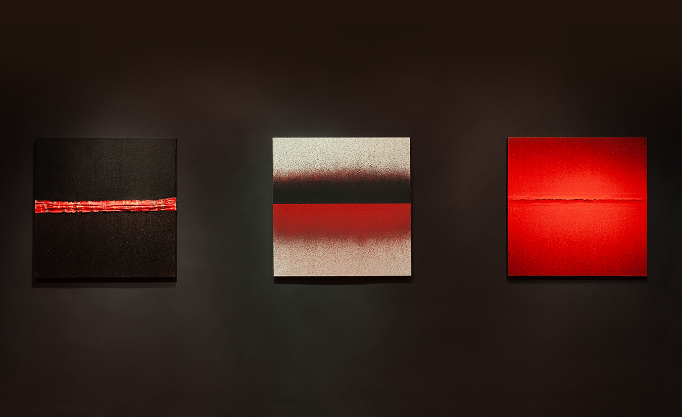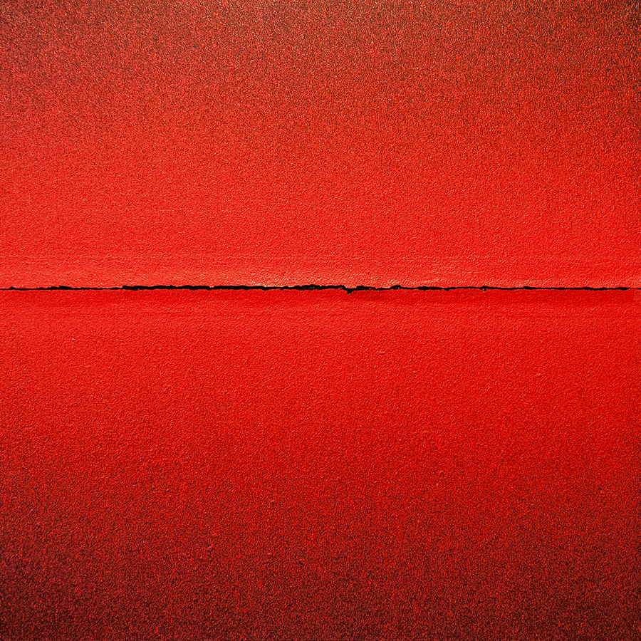 The painting set was created as a result of experiments on the surface of the canvas. The images have a unified 1x1m format. The compositions are very simple, mathematically drawn, stiff, less unhampered. Each image is characterized by a narrow range of colors, so the attention is focused on the meaning of the matter that goes beyond the two dimensions. The tears running through the center of the paintings are framed with subsequent layers of paint visible in the cross-section which are representing successive “lives” of the painting.