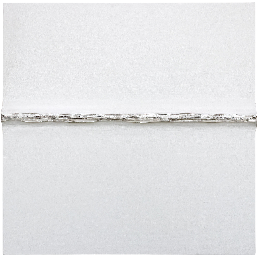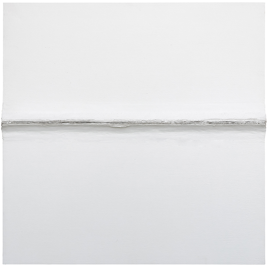 The artist destroys the flat, solidified paint layer, rips it off the canvas, cuts it and reapplies it. The flat painting becames spatial simultaneously. The white color of the paint focuses attention on the matter, which builds up space in artwork, paradoxally without using color.